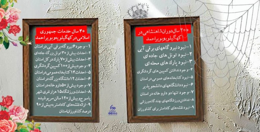 صبح زاگرس با زبان پوستر در گفتگویی با گذشته خدمات ۴۰ساله انقلاب اسلامی در کهگیلویه و بویراحمد را با ۲۰۰سال دوران ظلم ستم شاهی مقایسه کرده است.