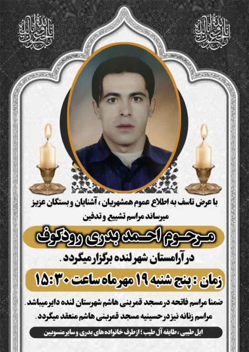 به گزارش پایگاه خبری تحلیلی«خبرلنده» فتاح بدری از همکاران رسانه ای و مدیر و مسئول پایگاه خبری آوای رودکوف در شهرستان لنده در غم از دست دادن برادر خود عزادارشد.