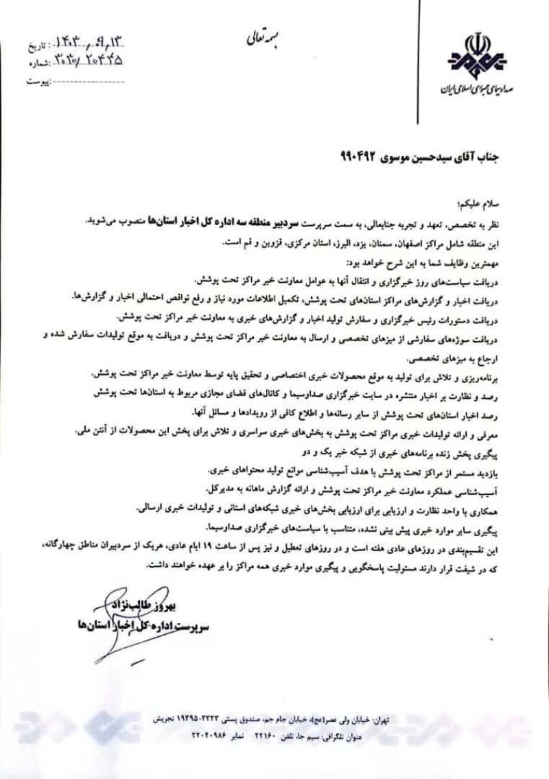 به گزارش پایگاه خبری تحلیلی «خبرلنده» سرپرست اداره کل اخبار استانهای صداوسیما در حکمی سید حسین موسوی از فرزندان کهگیلویه و بویراحمد را بهعنوان سردبیر منطقه سه اداره کل اخبار استانها منصوب کرد.